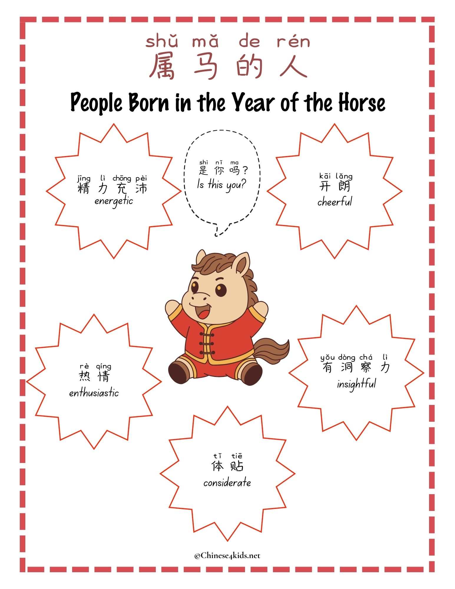 This Year of the Horse Chinese Learning Pack for kids is a great printable pack for young Chinese learners. With this pack, students can learn about some fun facts of the year of the horse in addition to some Mandarin Chinese around the Chinese New Year of the Horse.